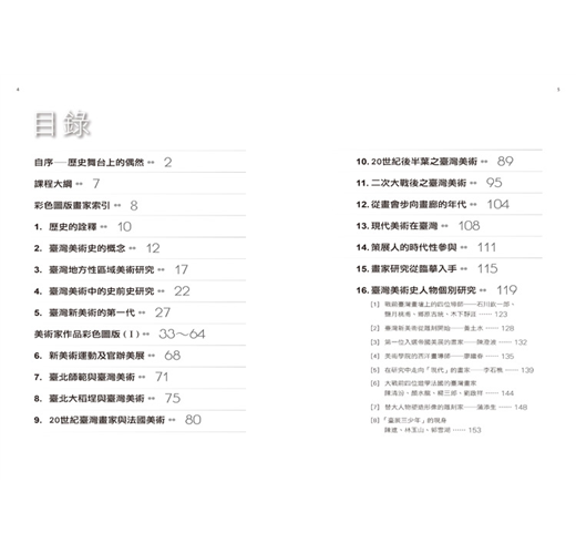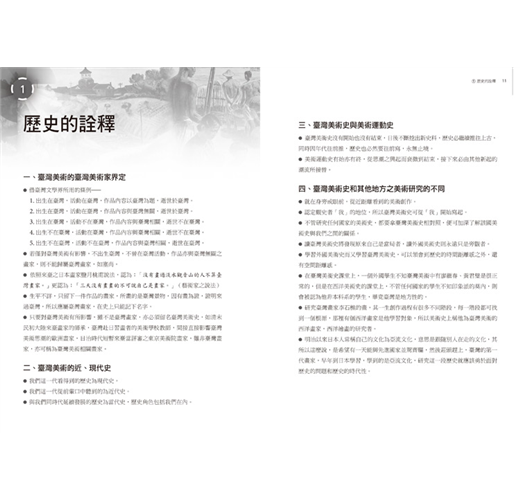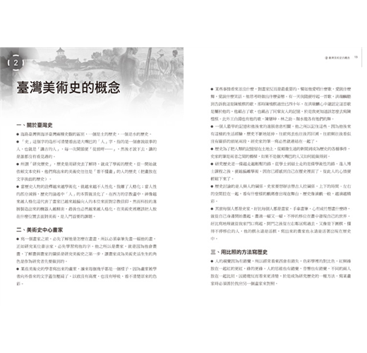 全書內容從對美術史概念的釐清開始論述,進而將歷史斷代,之後便著手於比較臺灣美術史中的「人、事、時、地」,於每個章節中不時提出加假設性的疑問,引導讀者做辯證性的思考,建構出從「自我文化主體」所延伸的史觀,理解臺灣本是世界的一員,人類美術史上曾發生的,於臺灣也無可例外。