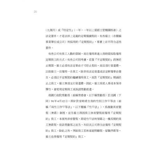 我國行政院勞動部(前稱勞委會,以下稱勞動部)於民國(下同)91年4月12日,即針對當時甫生效的性別工作平等法(前稱「兩性工作平等法」,以下簡稱「性平法」),為推動其育嬰假(無薪)制度,宣告雇主得因員工休育嬰假而僱用「定期契約」員工。本案所涉育嬰假,即是性平法所保障之一種長期的員工無薪假,依該勞動部之宣告,布拉沃公司得合法僱用「定期契約」員工。除此之外,例如員工若休家庭照顧假、留職停薪等,雇主也得僱用「定期契約」員工。「試用員工」雖是常見的僱用型態,其實勞基法早已刪除「試用期」之規定,一旦受公司僱用,即使是試用期間的員工,其受勞基法保障的權利、對雇主應有之義務,與所謂「正職員工」並無不同,包括雇主須具備法定資遣或解僱事由才能予以合法解僱。不過,就「試用員工」其能力是否勝任工作一點,實務上多給予公司較大的裁量權限,但仍非無須符合法定資遣或解僱事由即能任意解僱。而若確實不能勝任而終止其僱傭關係,雇主仍需依法給予資遣預告通知(凡受僱三個月至一年者,應有十天預告終止期)及資遣費。