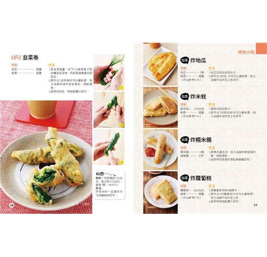 台灣傳統又道地的小吃,一直深受社會各階層人士的喜愛,也是外國人來台觀光的必嚐美食。本書就要教大家如何輕鬆學會台灣小吃的「撇步」,在家也能做出媲美店家的道地小吃。書中將會提供超過150種耳熟能詳的招牌小吃配方,包括蚵仔煎、蚵仔麵線、滷肉飯、雞肉飯、花枝羹、肉圓、蚵嗲等,還有搭配小吃不可或缺的誘人醬料。內容豐富、不學可惜喔!