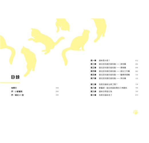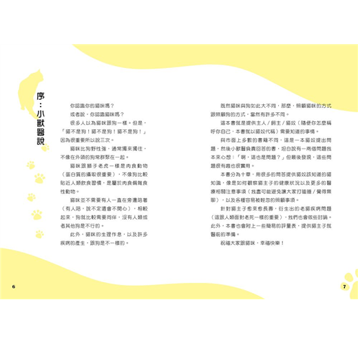 針對貓主子越來越長壽,衍生出的老貓疾病問題(這跟人類面對老死一樣的重要),我們也會做些討論。此外,本書也會附上一些簡易的評量表,提供貓主子就醫前的準備。