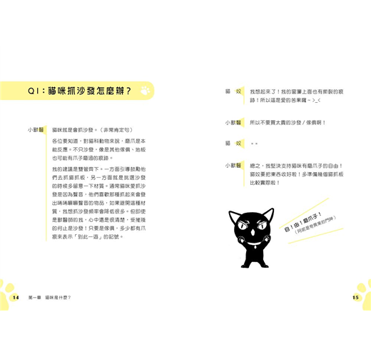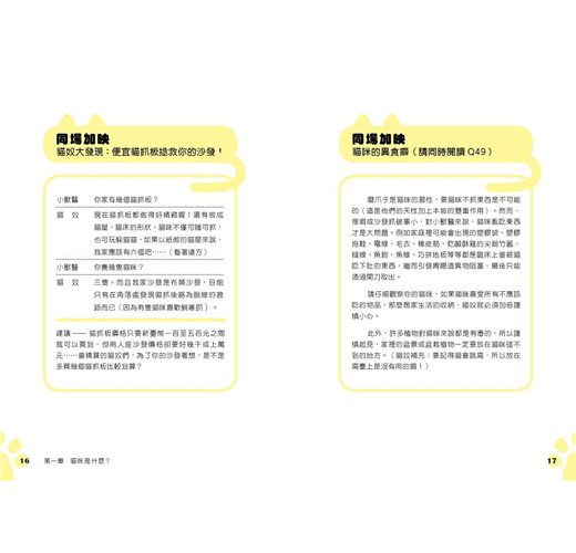 與市面上多數的書籍不同,這是一本貓奴提出問題,然後小獸醫負責回答的書,坦白說有一兩個問題我本來心想:「啊,這也是問題?」但最後發現,這些問題很有趣也很實用。