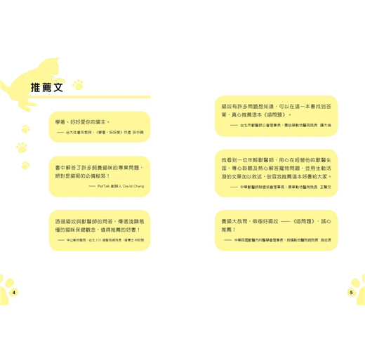 書中解答了許多飼養貓咪的專業問題,絕對是貓痴的必備秘笈!~PetTalk創辦人 David Cheng
