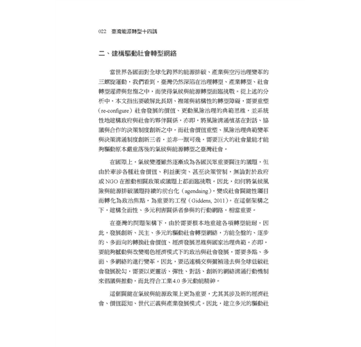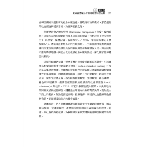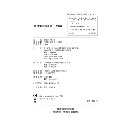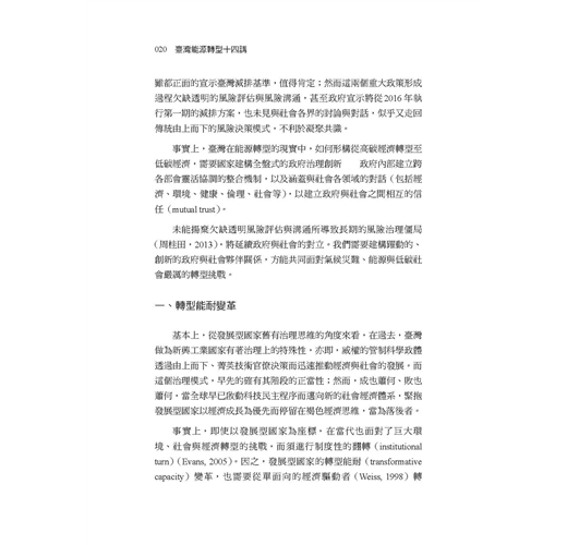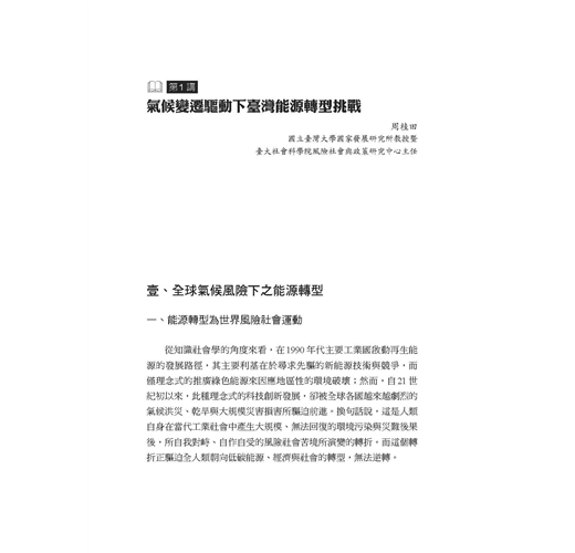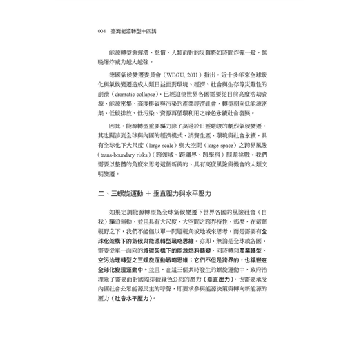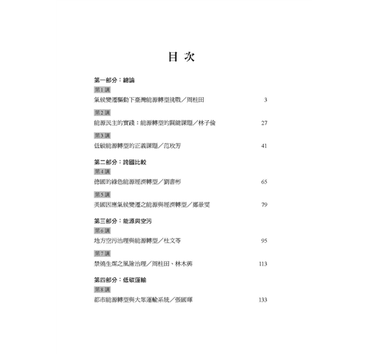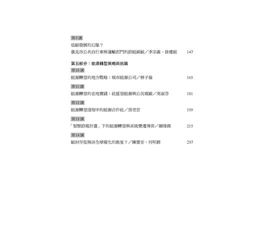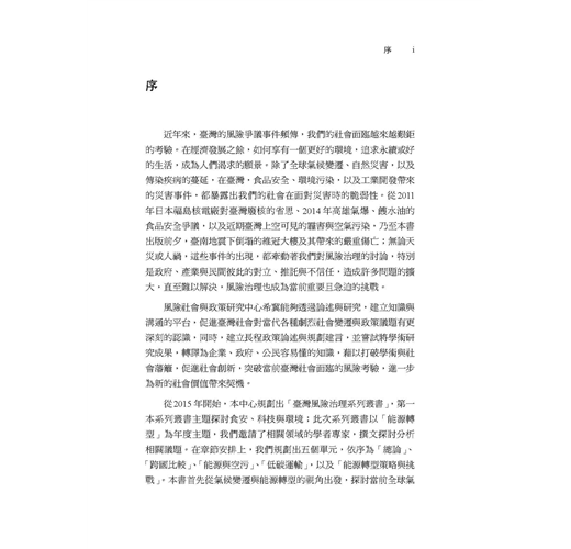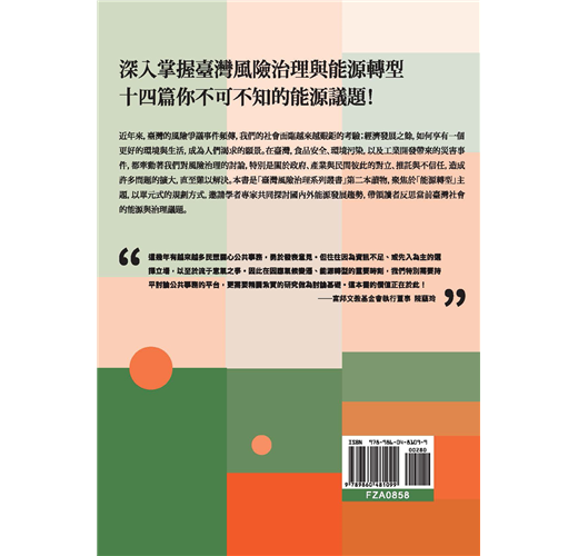 本書是「臺灣風險治理系列叢書」第二本讀物,聚焦於「能源轉型」主題,以單元式的規劃方式,邀請學者專家共同探討國內外能源發展趨勢,帶領讀者反思當前臺灣社會的能源與治理議題。