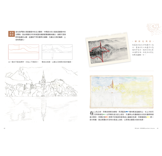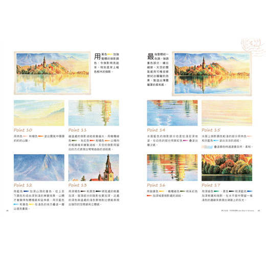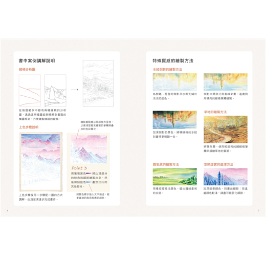 本書每幅作品皆會呈現整體畫面的明暗對比,提點畫面結構與速寫步驟。接著標示出局部細繪手法,詳解點觸、線繪、大面積的塗抹技巧,進而營造光感、空氣感等景致氛圍。無論是暖色調的旭日、餘暉,綠意盎然的鄉間、花田;還是冰霧瀰漫的北國之景、高山雲海,還有倒映在湖面、海上隨波起伏的暈影。慢下腳步,運用色鉛筆,細細描繪出無法裝進相機的那份心靈悸動吧!