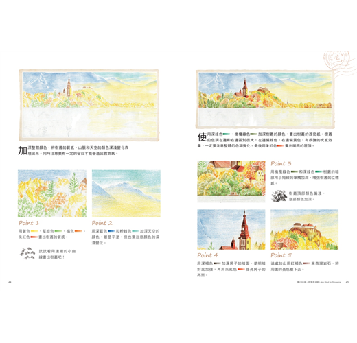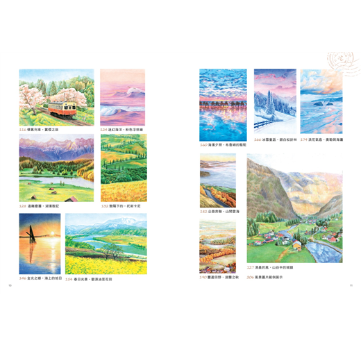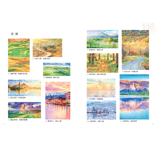 28幅風景繪,收錄了歐風小鎮、原野、麥田、海洋、森林與湖光山色,還有每日的魔幻時刻、晨曦與皓月。夢中的古堡,想像中的海天一色,還有某次親眼見證的落櫻繽紛,在彩筆下,都成為紙上最美的行旅痕跡。