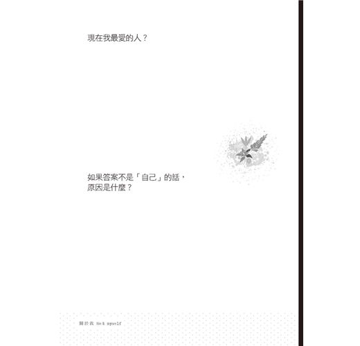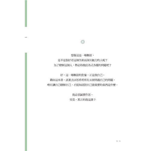 專業心理諮商師們暖心推薦 (依姓氏筆劃順序排列) 臨床心理博士 何雪綾 臨床心理師 洪仲清 諮商心理師 周慕姿 社會工作師 涂喜敏 諮商心理師/作家 蘇絢慧 「我覺得這本書很適合給迷失自我的讀者看,裡面的問題能讓人很詳細地瞭解自己,是從來都沒想過的自己,這本書可以讓許多人找到自己。」──大學生 佳純 「短短幾行字的提問,也許同樣是你心底對自己最深的疑問;這本書帶領你思考並記錄下最真實的自己!」──大學生 薏岑 「我開始學會問自己問題,讓瞭解自己變成一種習慣,我真的很慶幸在茫茫書海中,遇見了這本書。」──上班族 小琪