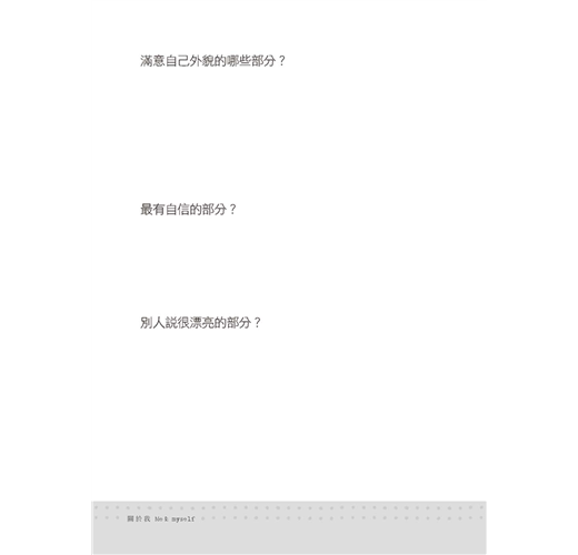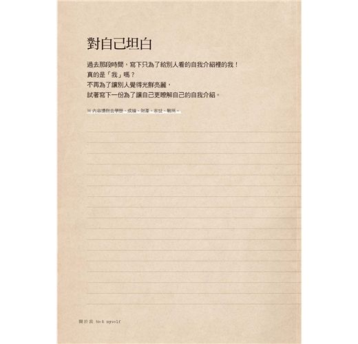 擺脫別人的標籤與定義,只有我能定義我自己 為什麼,我們找不到真正瞭解我們的人呢?難道說,是我們身邊重要的人,都不願意花時間瞭解我們嗎?但你覺得你夠瞭解自己嗎? 諮商心理師 周慕姿 在我們的人生中,有多少機會,能夠好好地與自己相處,和自己對話? 你覺得,你夠瞭解自己嗎? 很多時候,我們忙碌應付著世界的張牙舞爪。一波波的訊息,一波波別人告訴我們的「你是怎樣的人」、「你該怎麼做」;我們忙著被別人短暫的瞭解,被別人定義,然後,我們接收,以為那就是自己。 有的時候,我們覺得疲倦,尤其是當別人理解的「我」與我所理解的不相同時,我們大聲疾呼,想要努力解釋,想要被理解更多⋯⋯卻徒勞無功。 那時,我們的心裡,可能會出現這樣的聲音:「我好想要一個真正瞭解我的人。」 然後,我們會期待,可能期待我們的家人、或是伴侶,能夠成為這樣的人。但很多時候,我們會失望;於是,覺得這個世界不可期待,覺得沒有真正看重、理解我、甚至愛我的人。 但為什麼,我們找不到真正瞭解我們的人呢?難道說,是我們身邊重要的人,都不願意花時間瞭解我們嗎? 或許更深的原因,並非因為對我們重要的人,不願意理解我們;而是因為連我們都不夠瞭解自己,也沒有機會花時間瞭解自己。你,覺得你瞭解自己嗎? 《練習問自己:關於我,Me&myself》是一本「關於自己」探索指引工具書,從「瞭解自己真正的模樣」、「找出自己的魅力」、「微小的事情也算成就」,或是幫助瞭解自己容易焦慮的狀況,找到「舒緩緊張的方法」。當可以做到瞭解自己、看見自己的優勢,進而肯定自己,也讓自己可以應付容易緊張、焦慮的情況時,對自己的信心也慢慢增加,也更能檢視與他人的關係。如果我們的人生掌控權在別人手上;自己想做什麼事情,其實都是為了迎合別人、或是別人決定的,我們的自信也會在這樣的互動中消磨殆盡。 所以,為了幫助我們檢視與他人關係對我們生活造成的影響,書中接下來幫助我們思考「討好別人的自己」與「當自己人生的主人」的重要題目。唯有找回自己人生的主控權,我們才有能力做到「變得幸福」、「找到並達成自己的目標」,且認真規劃、實行「我所描繪的人生」。 這本僅有十章的書,篇幅不多,卻是本方向清楚、適合「與自己對話」的實用工具書。如果你想要更瞭解自己,卻又不知道如何著手,好好地回答《練習問自己:關於我,Me&myself》中的問題,或許,你會更瞭解自己真正的模樣。 那麼,你就有機會擺脫別人的標籤與定義。 記得:唯有你自己,才能定義自己。 任何面向的「我」都值得被接納與理解 自我理解與自我照顧的旅程不是一場競爭,也沒有絕對的終點,每往前一步都是累積。 臨床心理師、臨床心理學博士 何雪綾 這是一本給自己的自我介紹書。 不同於其他常見的心理自助書籍,這本書採用極少的文字、提供有限的訊息,試圖騰出大量空間讓讀者能夠參與這本書的創作,進而創造出自己獨一無二的自我介紹書。書的開頭首先提醒讀者創作參與的守則—對自己坦白。這除了要我們試著擱置過去對自己各種不夠完美的擔憂,更提醒我們該練習去信任身處的環境。只是在本書中,這個練習的環境,就是我們自己。 《練習問自己:關於我,Me&myself》在書中進行好幾個層次的練習。首先,我們練習透過仔細地回答關於自己的各種問題來完整認識自己。平常向別人介紹自己時,我們總習慣篩選特定的面向示人;透過逐一回答這本書的問題來介紹自己,能讓我們跨出那個慣常的篩選範圍,看到自己過去或許疏忽、或許逃避的部分。而自信的建立,往往不只在於肯定自己的好,更在於接納自己的不好,找到自己真實的位子,心裡的篤定便油然而生。建立自信的過程,最基礎的步驟便是透過覺察,充分而完整地接納自己。 接納與理解自己,是這本書帶領我們進行的第二重練習。「自問自答」的設計使讀者能體驗不同的角色觀點。回答問題時,我們是生活於日常世界的自己;向自己提問並且等待、聆聽答案時,則是從他人的角度觀看著的自己。扮演後面這個角色,最重要的心態是「接納」。 「接納」是心理治療歷程中關係建立的核心,透過治療師承認個案的經驗感受皆有其來由,個案能在治療關係中感受到被接受與包容,進而學會能放下評價、理解自己,改變的契機可由此產生。因此在這本書中,我們需要提醒那個提問的自己,去承諾開放一個空間讓各種各樣的「我」展現出來、承認各種「我」以及「我的行為」都有其來由;儘管在價值選擇上我們不盡然希望自己如此表現,但在觀看自己的這個當下,我們相信任何面向的「我」都值得被接納與理解。最後一重練習,是對自己產生好奇心。 這本書鼓勵讀者完成之後,亦可反覆閱讀。因為這樣自問自答的過程裡,經驗是不斷流動累積的。在心理治療中,每當個案多接納與理解自己一點,便有機會對自己的狀態形成新的觀點,從而發現過去難以發現的改變機會。完成自己的自我介紹書以後,再試著重複以第三者的眼光回頭看看自己與自己的互動,看看自己在過程中的坦誠與勇敢,也看看自己對自己的接納與理解,會讓我們更意識到自己在單一觀點之下可能受到的侷限,從而對於自己的各種可能產生更多期待。 最後,投入這個創作的過程之前,我們也需要有心理準備:探索自己、照顧自己,甚至改變自己,都是耗費心力的。有時我