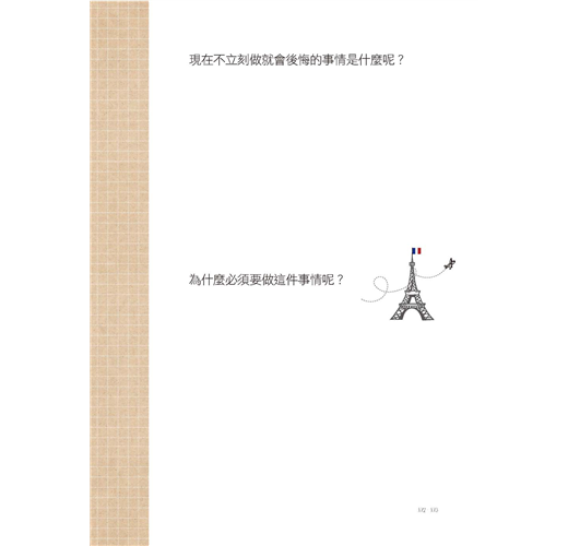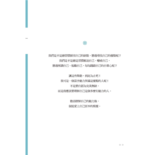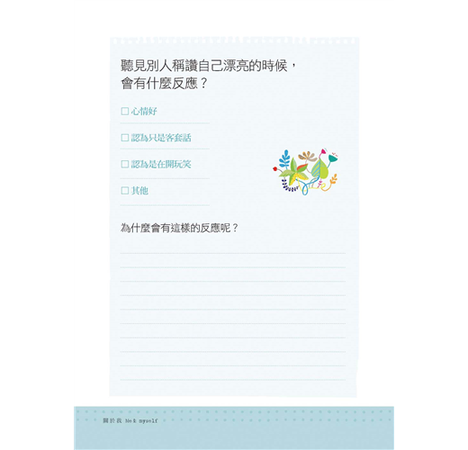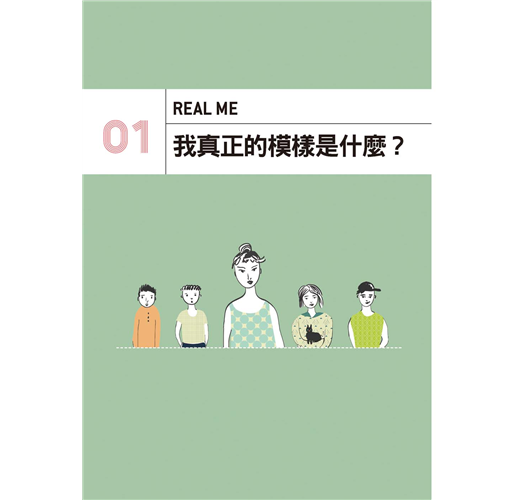 使用說明書 01 REAL ME我真正的模樣是什麼? 02 ATTRACTION找出我的魅力? 03 SUCCESS微小的事也算成就? 04 ARRANGMENT替自己進行心靈大掃除! 05 JUST RELAX舒緩緊張的方法? 06 YES OR NO告別討好別人的自己 07 ON MY OWN當自己人生的主人 08 HAPPINESS我想變得幸福 09 FIRST STEP達成我的目標? 10 DRAW MYSELF我所描繪的人生?
