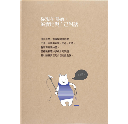 VIDEO 送給渴望瞭解自己的你,專屬你的互動禮物書 想瞭解別人之前,請先瞭解自己 一本解讀自己內在的最佳互動書 寫下來,我才知道什麼對自己來說是最重要的; 寫下來,我才記得我多麼有魅力; 寫下來,我才想起我是個下定決心就能搞定一切的人。 每天練習問自己,一天比一天更瞭解自己! 接受自己原本的模樣,並對此深信不疑; 醒悟人生當中最重要的人,不是別人,正是自己。 從現在起,練習問自己,練習仰賴自己,練習相信自己! ●開始找尋真正的自己 大部分的人都不知道如何找尋「真正的自己」,從寫一份自我介紹開始吧! ●從「刺中心坎」的問題認識自己 沒有必要從頭開始閱讀或使用本書,有些問題或許沒辦法立刻回答出來,請不要著急,總有一天,答案會自己出現。 ●讓瞭解自己變成一種習慣 空閒、心煩、等朋友的時候,睡覺之前思考書中問題,讓這本書逐漸滲透自己的生活,便能發現自己時時都在為人生作答。 ●再也不需要別人告訴你該怎麼做 越是經常利用這本書做紀錄,越能清楚知道自己是誰、內心真正的需求是什麼;最終,便能找到屬於自己的那條路。 寫下自己的人生哲學 *不重要的事:別人是怎麼看我的?重要的是:我是怎麼看自己的? *魅力是以獨有的外貌和個性,殘留在別人心裡的印象。 *成就並不是在實踐野心,而是讓自己感到快樂和自信。 *清理得無事一身輕的現在,正是可以用嶄新、新鮮的事物重新填滿之時刻。 *生活在唯有鬥牛才能得到稱讚的世界裡,不妨活得像一隻幸福的黃鼠狼。 *不要為了讓全世界覺得我是個好人,耗費過多的能量。 *不要為了迎合別人的步調,而將「狗」說成「貓」。 *為了明天,而保留了今天的幸福,有什麼意義嗎? *我真正想要的目標與全世界都說好的目標,是兩者中的哪一個呢?