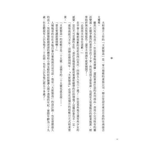 人稱勉哥的佐佐木勉自暴自棄地說出這句話,他是「天使製造」的設計師,也是資歷最久的員工。宛如狸貓般圓滾滾的體型和小朋友般的娃娃臉讓人猜不透他的年紀。實際年齡為三十九歲,但是聽說有人以為他才二十出頭,也有人以為他已經五十多歲了。