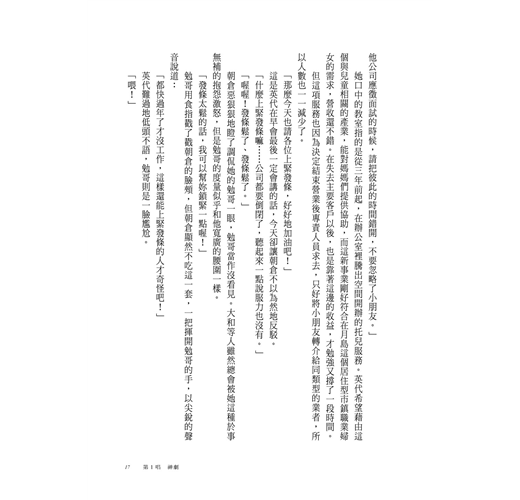 她口中的教室指的是從三年前起,在辦公室裡騰出一個空間開辦的托兒服務。是英代基於童裝是和兒童有關的行業,希望能協助母親們所提供的新事業,剛好符合在月島這個居住型市鎮工作的女性需求,營收還不錯。在失去主要客戶以後,也是靠著這邊的收益,才勉強又撐了一段時間。