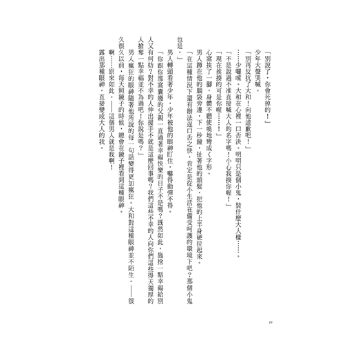 「你跟你那窩囊廢的父親一直過著幸福快樂的日子不是嗎?既然如此,施捨一點幸福給別人又有何妨?對不幸的人伸出援手不就是這麼回事嗎?我們這些不幸的人向你們這些得天獨厚的人搶奪一點幸福並不為過吧!你說是嗎?」