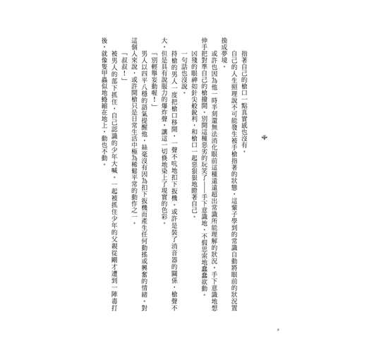 持槍的男人曾經一度把槍口移開,一聲不吭地扣下扳機。或許是裝了消音器的關係,槍聲不大,但是具有說服力的爆炸聲,讓這一切倏地染上了現實的色彩。