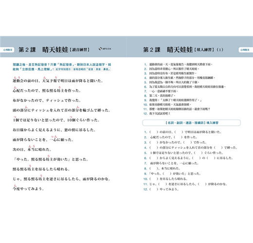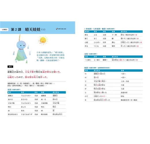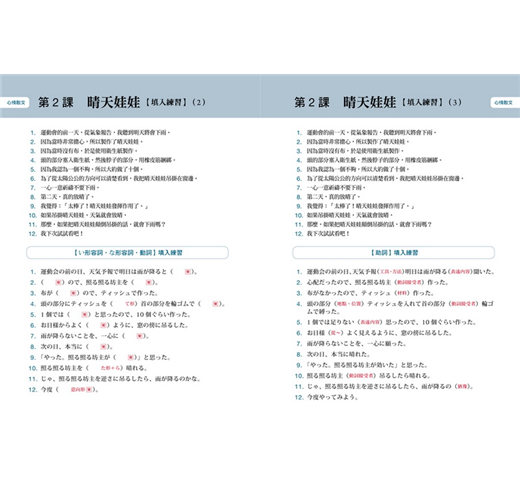 每課均有三種填入練習,針對不同題型,給予答題的「文法提示」。學習者可彙整學習過程,明確驗證「是否學有所得」。