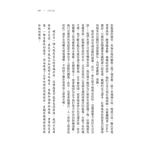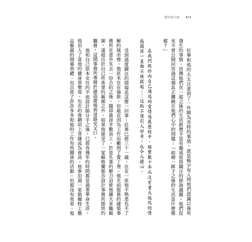 當愛情誕生,經歷一連串的驚喜與無聊之後,要如何保持浪漫的鮮度?在生存的壓力之下,愛的面貌會如何幻化(請注意:不是幻滅)?從哲學與心理學的細膩洞察,狄波頓告訴我們,浪漫主義總是幫倒忙,現實裡極少有任何事物能夠達到完美。度過人生需要極大的勇氣,即使再平庸的人生也不例外,這時身邊若有個人,是否就能給予我們足夠力量面對人生的種種要求?