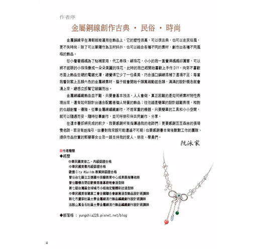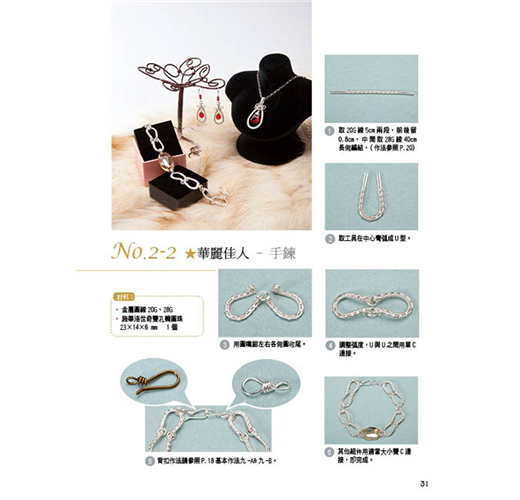 本書詳細教您金屬線塑型的基本技法,再逐步教作項鍊、手鍊、戒指及耳鉤,共十四套組(20款以上)飾品的製作方法,學成了還可以舉一反三,發揮創意設計更多變化作品,書內還附上20款進階作品欣賞,激發讀者的美學潛能。