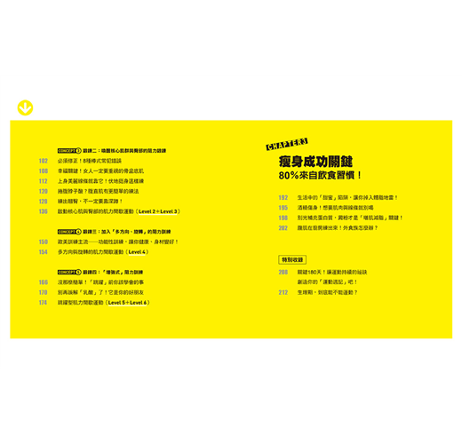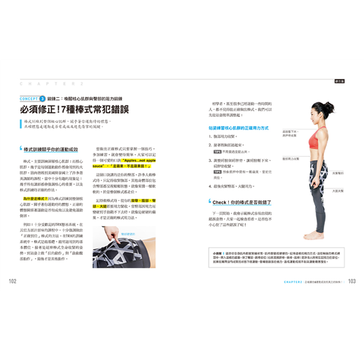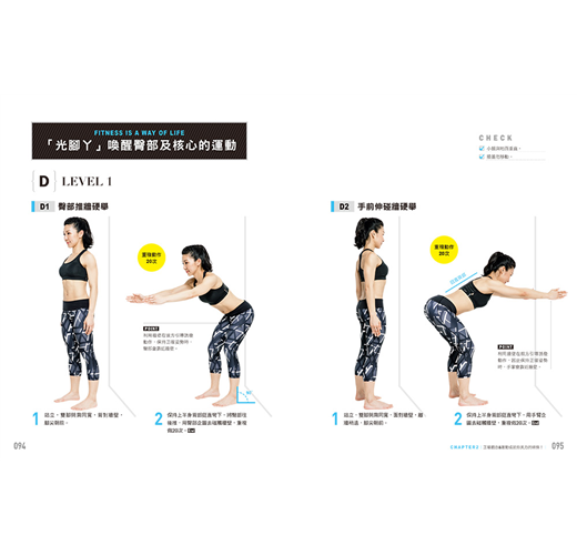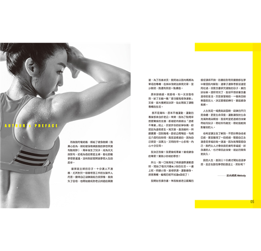 【CHAPTER1】 改變的勇氣 現實是「阻力」,更是「助力」! 臭臉「煮」婦,感情走味給我當頭棒喝! 誰說當媽後,不能勇闖職場? 媽媽族,如何在職場找到立足生機? 中年轉業危機,也是契機!JZ Fitness萌起 創業、不創業,一定要準備好的幾件事! 不會太老嗎?33歲念書拼證照、搏轉行 麵包與時間不可兼得?其實是有方法的! 運動,讓你從「心」認識自己! 【CHAPTER2】 正確觀念運動 成就你美力的線條! ◆CONCEPT1 運動前,你必須搞懂這些事 運動,如何開始才有效? 分不清有氧、無氧運動,夠累夠喘就對了! 由基礎開始!運動前練習 ﹛A﹜前後與左右移動練習 A1身體前後移動 A2身體左右移動 A3身體前後移動+摸腳尖 A4身體側移+摸腳尖 ﹛B﹜多方向移動練習 B1右邊5點鐘方向移動+屈膝抬腿 B2左邊7點鐘方向移動+屈膝抬腿 ﹛C﹜腳踝關節運動 想變瘦?別再執著「燃燒脂肪」 阻力運動,女生這樣做最有效! ◆CONCEPT2 鍛鍊一:一切都從腳底開始! 久坐、用電腦、滑手機,身材走樣的兇手 喚醒臀部與核心肌群,從「脫鞋」開始! 美鞋無法給你「美腿」!足底筋膜炎危機 「光腳丫」喚醒臀部及核心的運動 ﹛D﹜LEVEL1 D1臀部推牆硬舉 D2手前伸碰牆硬舉 D3相撲蹲+踮腳 D4單腳後點地臀部運動 D5單腳弓箭步落地抬腿平衡 ◆CONCEPT3 鍛鍊二:喚醒核心肌群與臀部的阻力鍛鍊 必須修正!7種棒式常犯錯誤 幸福關鍵!女人一定要重視的骨盆底肌 上身美麗線條就靠它!伏地挺身這樣練 捲腹脖子酸?腹直肌有更簡單的練法 練出翹臀,不一定要靠深蹲! 啟動核心與臀部的肌力間歇運動 ﹛E﹜LEVEL2 E1高棒式摸側腰 E2單腳弓箭步落地踢腿 E3棒式原地快速踏步 E4單邊臀部平衡踢腿 ﹛F﹜LEVEL3 F1換腳跳躍踢腿 F2高棒式單腳側前伸 F3伏地挺身+蝶式游泳 F4高棒式單腳側伸直 ◆CONCEPT4 鍛鍊三:加入「多方向、旋轉」的阻力訓練 歐美訓練主流──功能性訓練,讓你健康、身材變好! 多方向與旋轉的肌力間歇運動 ﹛G﹜LEVEL4 G1分腿後蹲軀幹旋轉 G2高棒式單腳斜內收+後上踢 G3橋式單腳畫圈 G4棒式腳外展+蜘蛛人 ◆CONCEPT5 鍛鍊四:「增強式」阻力訓練 沒那麼簡單!「跳躍」前你該學會的事 別再誤解「乳酸」了!它是你的好朋友 跳躍型肌力間歇運動 ﹛H﹜LEVEL5 H1單腳髖部抬膝跳 H2登山式+棒式開合跳 H3快速伏地+跳躍踢毽子 H4反撐棒式屈膝抬腳 ﹛I﹜LEVEL6 I1側向滑雪跳躍 I2高棒式單腳前跳 I3單腳髖部抬膝跳+換腿跳躍踢腿 I4棒式支撐往後移動 【CHAPTER3】 瘦身成功關鍵 80%來自飲食習慣! 生活中的「甜蜜」陷阱,讓你掉入體脂地雷! 酒精傷身!想要肌肉與線條就別喝 別光補充蛋白質,澱粉才是「增肌減脂」關鍵! 腹肌在廚房練出來!那外食族怎麼辦? 【特別收錄】 我的肌肥大運動鍛鍊菜單:循環式訓練 學者關鍵180天!讓運動持續的祕訣 生理期,到底能不能運動?