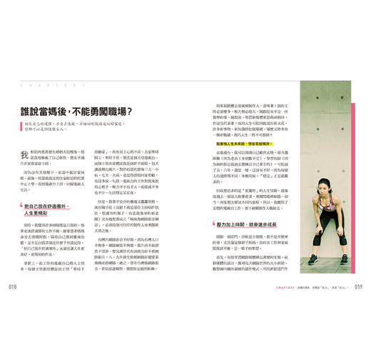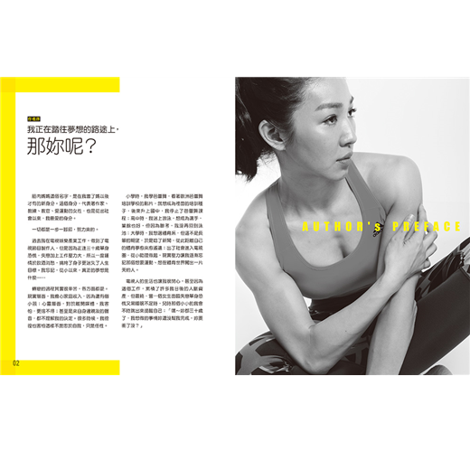 正在踏往夢想的路途上,那妳呢? 筋肉媽媽這個名字,是在我當了媽以後,才有的新身分。這個身分,代表著作家、教練、儲備教官、愛運動的女性,也是從出社會以來,我最愛的身分。 一切都是一步一腳印,努力來的。 過去我在電視娛樂產業工作,做到了電視節目製作人,但是因為正逢三十歲單身恐慌,失戀加上工作壓力大,所以一度鍾情於飲酒消愁,搞垮了身子更迷失了人生目標。我忘記,從小以來,真正的夢想是什麼…… 轉變的過程,其實很辛苦,各方面都是。現實層面,我擔心家庭收入,因為還有個小孩;心靈層面,對於離開媒體,我害怕,更捨不得;甚至是來自身邊親友的聲音,都不理解我的決定。很多時候,我彷徨也害怕這樣不是忠於自我,只是任性。 小學時,我學芭蕾舞,看著歐洲芭蕾舞培訓學校的影片,就想成為裡面的培訓種子,後來升國中,我停止了芭蕾舞課程;高中時,我迷上游泳,我想成為選手,業餘也好,但因為聯考,我沒再回到泳池;大學時,我想選體育系,但這不是長輩的期望,於是我唸了新聞,從此距離自己的體育夢,愈來愈遙遠;出了社會進入電視圈,從小助理做起,現實壓力讓我逐漸忘記那個想要運動、想在體育世界闖出一片天的人。 電視人的生活也讓我很開心,甚至因為這個工作,累積了許多我日後的人脈資產,但最終,當一個女生面臨失戀單身恐慌又常睡眠不足時,兒時那個小小的我,會不時跳出來提醒自己:「嘿~妳都三十了,我想做的事情你還沒幫我完成,妳要衝了沒?」 而後我閃電結婚,嫁給了健身教練(我真心認為,嫁給教練跟我的夢想其實有點關聯),兩年後生了兒子,成為天天與尿布、奶瓶為伍的家庭主婦,看似距離夢想更遙遠,沒料到卻是開啟夢想人生的起步。 當家庭主婦的日子,十分讓人不適應,尤其對於一個曾埋首工作的女製作人而言。覺得自己沒賺錢能力很頹廢,我喪失了自信,也開始變成對老找碴的黃臉婆,為了改善狀況,我開始以筋肉媽媽為筆名的專欄,在姊妹淘網站撰寫文章,至少顯現,我還有那麼一點價值。 原本聊婚姻、寫愛情,有一天突發奇想,給了主編一篇「夏日魔鬼瘦身運動」文章,卻大獲網友好評,從此開啟了運動專欄的生涯。 我不是專科,原本不懂運動,運動的專業都來自於老公。常常,我為了點閱率想要驚悚的主題,都被筋肉爸爸以「這樣不專業」阻止,於是許多的紛爭吵嘴,都是為了這樣產生。寫文章、查詢資料、照顧寶寶、回到職場、跟老公鬧彆扭,有將近八個月的時間,我是這樣過的,因為自己很空、沒實力,又同時得一心多用,內心十分空洞。 我決定改變!我要變成專業!變成健身的專家!實現小時候的夢想! 所以,我一口氣報名了兩張國際運動證照,開始了每天只睡4小時的生活。一邊上班、照顧小孩、進修研讀、運動健身、出版健身書,蠟燭已經不知道n頭燒了! 我開始苦讀念書,常夜晚被老公嚴厲的督促讀得不夠,唸書唸到每天睡覺都在夢中複習肌肉解剖,這輩子連聯考都沒這麼用功過。但是念書研究運動的日子,真的好快樂。證照考完了,我卻不想捨棄念書進修的生活,於是很冒險的,一個來自娛樂圈的女人,決定要徹底轉行,當起教練。 人生就是一場勇氣與冒險,鍛鍊的不只是身體,更是生命深度。運動讓我對生命充滿熱情與期盼,我很希望把這樣的快樂,帶給而兒子,帶給所有親友,帶給我能夠影響到的人。 也希望讓女生了解到,不管妳單身或著已婚,甚至離開了一段婚姻,寵愛自己永遠會是幸福的唯一通道,因為唯獨寵愛自己,我們女人才會由衷的擁有幸福感,妳身邊的人,也才會因此快樂,彼此的關係更長久。 我的人生,直到三十三歲才開始追逐夢想,且正在踏往夢想的路途上,那妳呢?