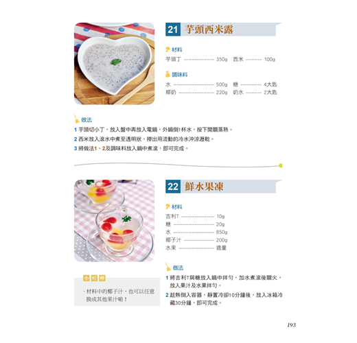 新書裡分享了近180道食譜,包括了醬湯、開味小菜、古早味私房菜、10分鐘家常菜、一鍋料理、冬季養生、功夫宴客料理、消夜飲品等8大類料理,我想不論是對新手、老手料理者來說,這本書肯定是本最佳料理秘笈。