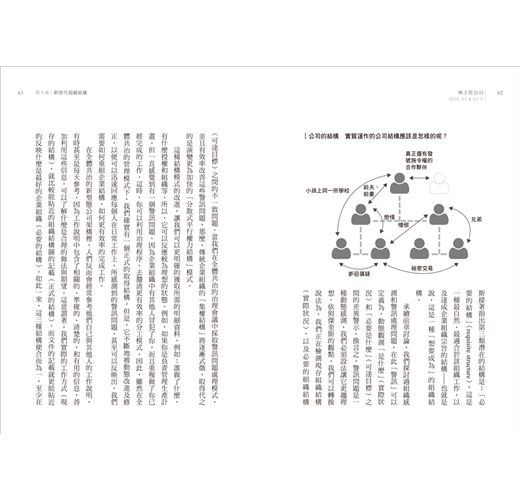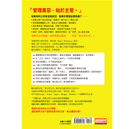 【推薦序】 無主管,反而讓我把事情都搞定 ──美國時間管理大師大衛.艾倫(David Allen) 二○一○年,在美國加州一場「自覺資本主義」(Conscious Capitalism)的研討會中,我與管理大師布萊恩.羅伯森同為大會的演講者,那是我第一次聆聽他所提出,一個完全創新、動態的組織理論觀點,用來構建和運行一個創新型態的企業組織,那場演講真是讓我如痴如醉,至今依然深感震撼。 當時,我自己還是剛起步的新創公司,在經營方面犯了一些錯。為了尋求突破,我願意嘗試,即便我不扮演執行長的角色,也能讓我那規模小卻充滿熱情的公司成功地自行運營。那時,我知道自己並不適合擔任公司的執行長,我反而比較適合擔任公司的代言人,以及「把事情搞定」(GTD)的熱情守護者,這種管理法是我所出版的《搞定!2分鐘輕鬆管理工作與生活》(Getting Things Done)一書中所推廣的方法。 多年來,我們不斷嘗試擴展我們的新創組織與工作,為世界各地日益增長的創新事業尋找新出路。我知道如果單憑自己的力量是無法克盡其功,只有開放擴大吸納更多創新突破做法,才有機會共同掌握未來的先機。然而,如果只是委託管理顧問公司來協助「運營新組織型態」,想要憑藉強烈的個體意識來影響整體的組織基因架構,恐怕一切還是緣木求魚。我清楚意識到,唯有徹底捨棄個人根深柢固的組織慣性,重新塑造新形態組織,導入新的準繩,才能駕馭真實未來新變局,開創新契機。 我想要一間不需要執行長的公司,至少不需要傳統意義上的執行長。 本書作者布萊恩所清楚傳達的訊息,提出「全體共治」(Holacracy)的創新模式,完全顛覆了我所認知的舊有框架,如果這種創新管理模式真的能像他所提出的那樣運作,那的確是我多年來所尋求的理想模式,所以我也欣然明快認為我自己的公司,應該全面採用這種創新管理型態,連我自己也更該身體力行貫徹這種新組織型態。尤其我想要深切體驗感受,這套新型態「無主管管理」是否真實有效,所以我告訴自己,要就是全公司全體上下徹底貫徹實施,否則就是全然否定,絕對不能半吊子,四不像地把組織型態與管理弄得很混淆。 我做了明確的直覺判斷,規劃了五年期專案,徹底貫徹「全體共治」的組織型態(在這一點上我很幸運)。即使剛開始我們對於這種全體共治的概念很不熟悉,甚至可說是跌跌撞撞,格格不入。但經過一段時間磨合摸索,我們的確找到企業如何全然接受與貫徹執行的長足益處,的確這種創新組織模式,是值得各界多方參與研究的──不論我們當時初創階段的企業體質是否羸弱,以及會面臨如何嚴峻的考驗,這實在是值得我們勇於嘗試的新契機。 我的職場生涯也一直圍繞著組織生產力績效提升而努力,一開始創業是為了個人,隨後則是深刻體認到企業組織成長的重要性。我深切了解到,當組織關鍵人物願意確實地實施執行把事情搞定的行為管理法則,那麼這種方法對於組織的整體生產力能獲得顯著的提升。然而,當我聽到布萊恩所提出徹底改變組織基本運作流程的創新管理模式後,我才認真體悟到「心如止水」(喻指我認為一個無欲則剛的領導者,最能貫徹實現「把事情搞定」的無我境界)對組織運營是很關鍵重要的,我很明白這是創新領導先行者,非常值得去探索的新型態管理制度。 我很榮幸能為這本書撰寫推薦序,我們公司是在三年前正式導入「無主管管理」這種全體共治的新組織概念,當初我們設定這是五年期的中程發展計畫。其實,要徹底改變一個組織的運作型態與系統,的確是一個很艱鉅的挑戰,更是一條沒有回頭的路。我們曾經自豪我們公司,不是傳統型態的企業組織,而是具備了時尚的公司特質──靈活、開放、全然透明的……。但當我們正式執行全體共治營運模式後,很明顯,我們依然得誠實面對一些固有舊習的障礙波折,才能徹底讓組織進行改造重整。 這故事的確像夢幻般,一切從開始就有正面積極的發展變化,讓我們組織能夠持續排除萬難,堅持這樣的改變。顯然,一旦你的企業組織也願意開始嘗試採用這套新經營模式,組織會議與內部溝通效率的明顯改善,都會讓你不會再想回復原狀,願意持續這樣的組織變革。一旦你願意放手一搏,你會真實感受到那原本一肩扛的「英雄式領袖」的無形壓力,終於可以徹底被解除,也徹底扭轉傳統領導者心有千千結的沉苛負擔,一切就像是順水推舟順暢運轉。 布萊恩表示,全體共治的無主管管理當然不是萬靈丹:它不會解決企業組織面臨的所有警訊問題和現實困境。但以我的經驗,這套做法確實讓我們從中體認到,企業組織在這種新創模式下營運,根基會更加穩健,讓每一位組織成員都可以了解、展開,並著手處理這些問題與困境。 有時候,總會有人喜歡提出針貶見解,來詆毀無主管管理這種全體共治的制度是難以發生實質作用。縱使太陽底下沒有新鮮事,要批評論斷都很容易,就算旁人想要戳一個洞,捕風捉影責難這套創新做法,但事實還是勝於雄辯。凡真實的身體力行,經歷過這樣組織的變革轉型,願意排除萬難堅持執行的人,必然能嘗到這套創新模式的甜蜜果實。 這套創新模式之所以美妙,並不在於哪些組織願意接受,或那些組織全然排拒,而讓人困惑遲疑是否應該採用。反倒是,經歷過的人都很樂意見證說明,採行這套新創模式,絕對會是非常值得嘗試的營運經驗!