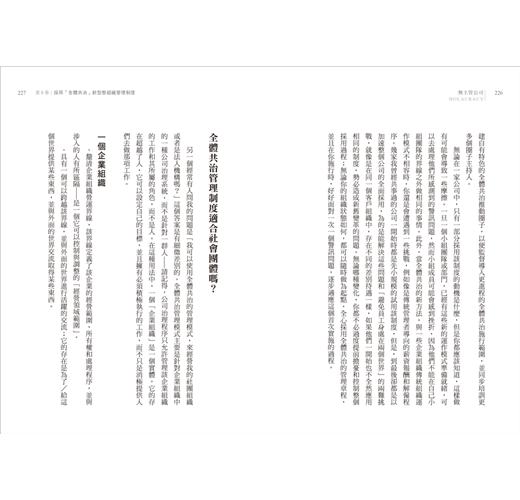 名人推薦:【重量推薦】 王文靜|商周集團執行長 李仁芳|政大創新管理教授 邱彥錡|Camp Mobile 台灣總經理 齊立文|經理人月刊總編輯 劉威麟Mr.6|網路趨勢觀察家 鍾子偉|關鍵評論網執行長暨共同創辦人 「全體共治的無主管公司,將徹底顛覆你我的世界!」──美國時間管理大師 大衛.艾倫(David Allen) 「第一次閱讀本書,你只是讓你看到一種組織管理模式的轉變,而每回再重讀一遍,每次都有新的領悟,尤其是當穿插實際的經驗做為印證時。」──Zappos執行長 謝家華(Tony Hsieh) 「全體共治能建構清楚的管理制度...