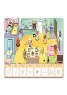 2.說:所有的物品及人物皆標註名稱,讓孩子練習一邊指著圖,一邊說出物品、人物名稱,遊戲中自然而然累積字彙,為將來的口語能力奠定基礎。