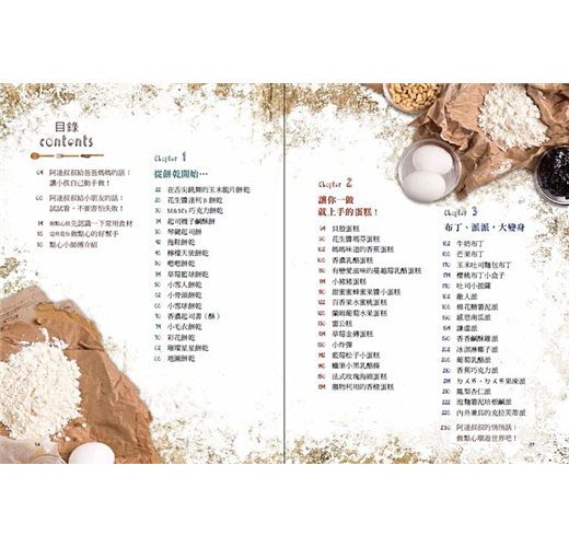 三大類點心內容:● 從餅乾開始:餅乾類 ● 讓你一做就上手的蛋糕!:蛋糕類 ● 布丁、派派,大變身:布丁 / 派類
