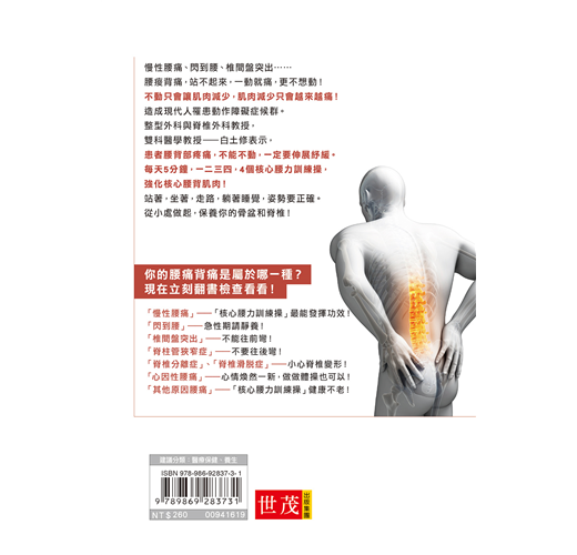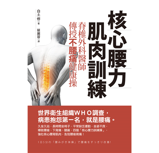 平時缺乏運動,坐姿不良,久坐久站,長時間坐椅子,現代人背部肌肉大量減少,導致腰痠、下背痛、腿麻,日本脊椎外科名醫,傳授四步驟「核心腰力訓練操」,強化腰背部肌肉,告別腰痠背痛!