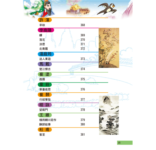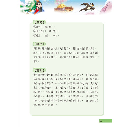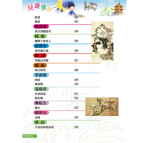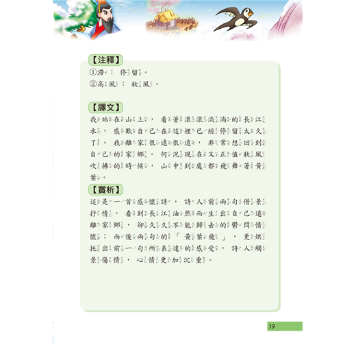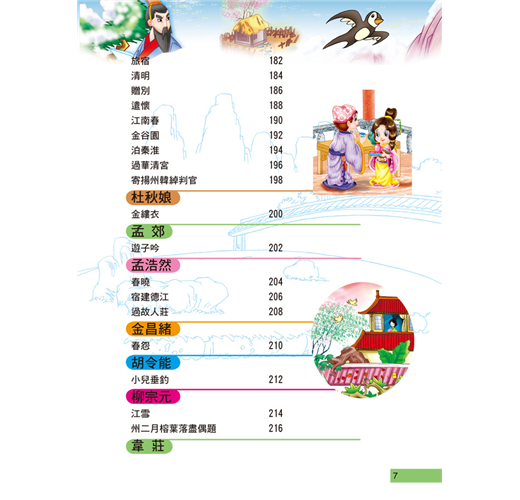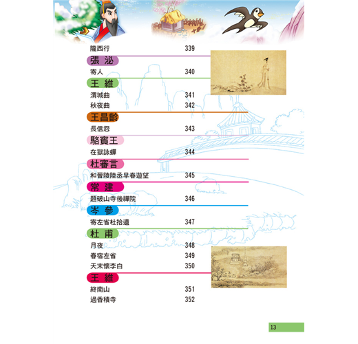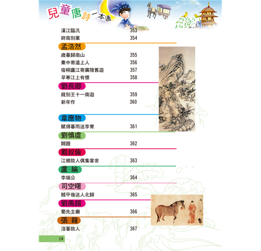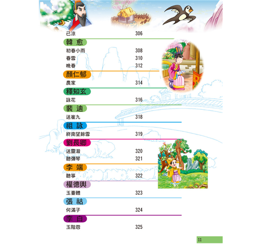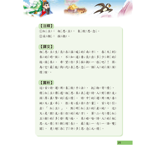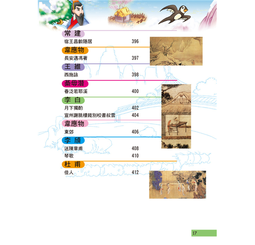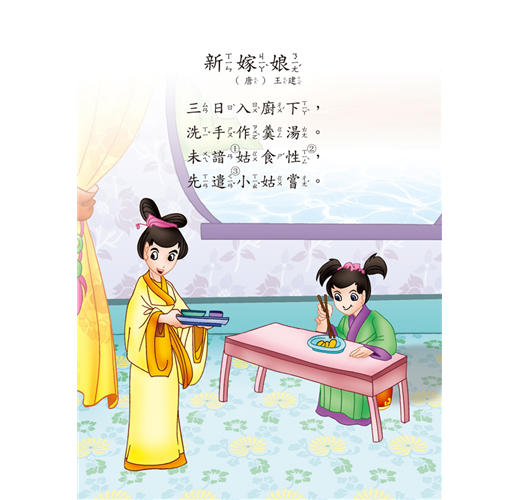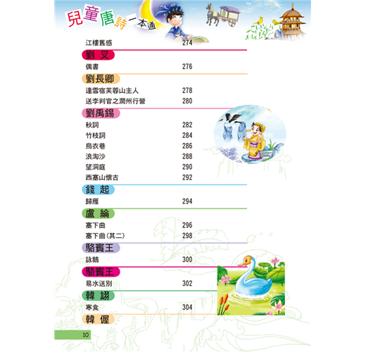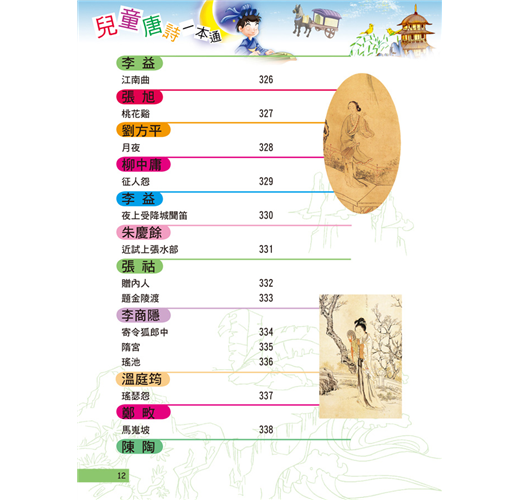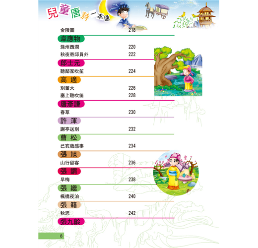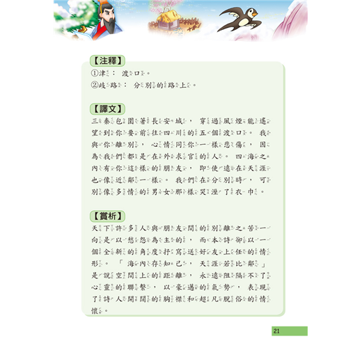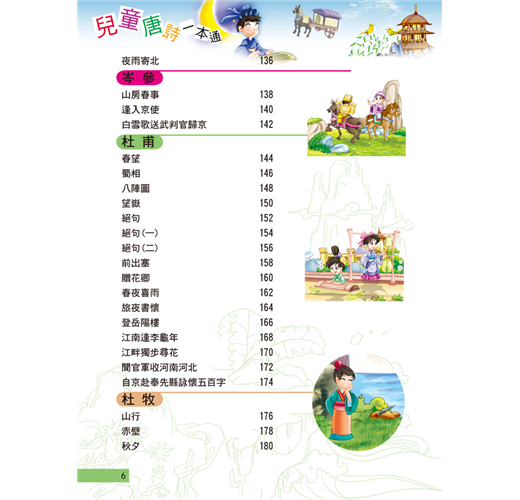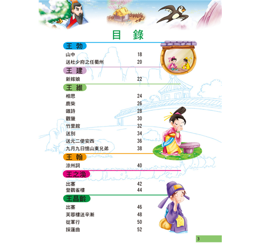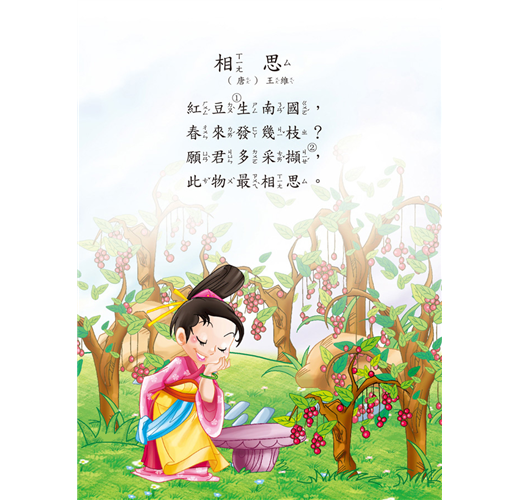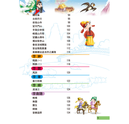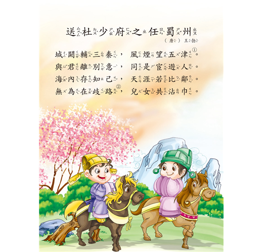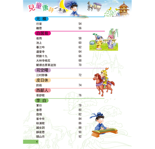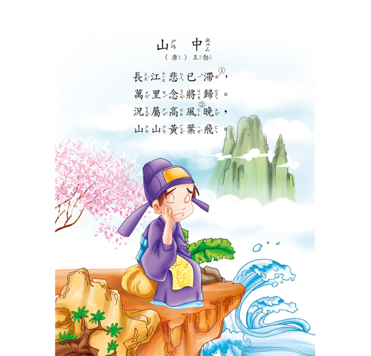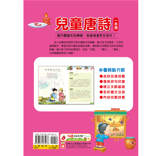 從小由唐詩培育孩子對於國語文的興趣,建立孩子的語言、文字的基礎概念,學習古詩中優良品德的涵義,潛移默化培養孩子對於品格的修養。書中除了詩句的學習外,附加「注釋」、「譯文」、「賞析」,以供閱讀時更深入理解。