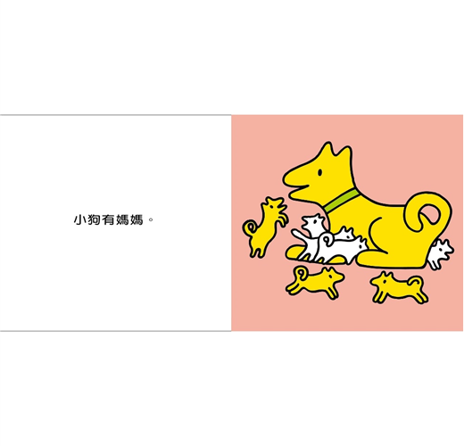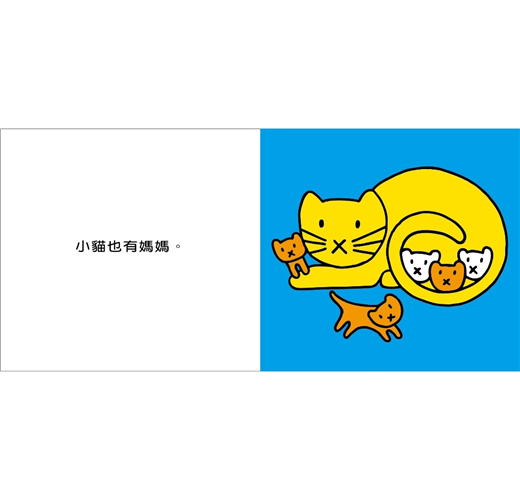 書中結合林良簡潔精鍊的文字,以及趙國宗用色明亮又飽滿的插圖,讓小寶寶透過小狗、小貓……小鴨等八幅母子動物圖,認識到媽媽的角色,知道每一種動物都有媽媽。媽媽會餵東西給寶寶吃,和寶寶一起遊戲、帶著寶寶出門去。也藉由動物間的親情關係,讓幼兒認知到媽媽對他們滿滿的愛,擁有安心成長的力量。