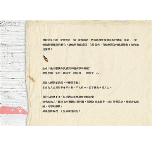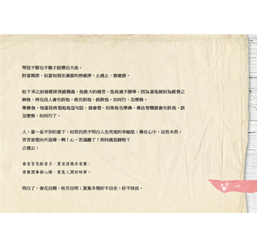 然而事實證明,心靈上真正的幸福,是愈能減去人生欲執、名利、情愛、喜貪……,就愈能回歸到一片無著無得的本然風光。