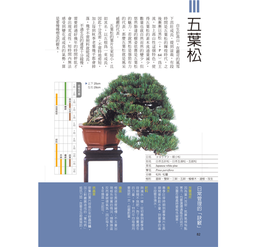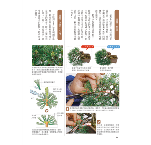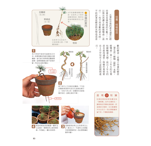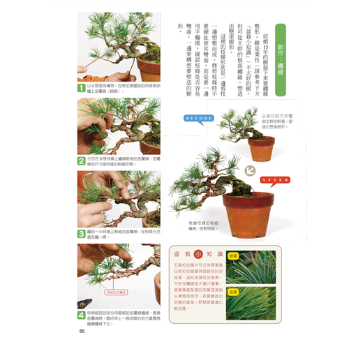換盆、摘芽、切芽、剔葉、剪枝、纏線、繁殖等,皆有手繪圖搭配實體照片進行步驟解說,對初學者而言相當容易實行。