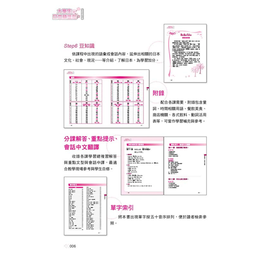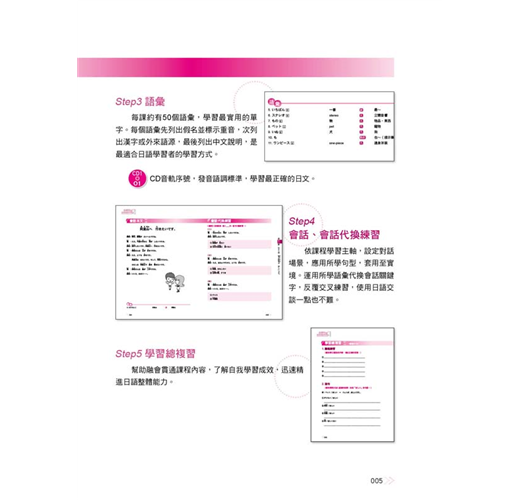 依課程學習主軸,設定對話場景,應用所學句型,套用至實境。運用所學語彙代換會話關鍵字,反覆交叉練習,使用日語交談一點也不難。