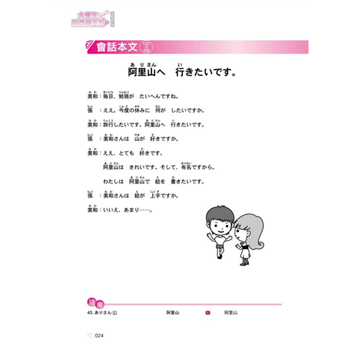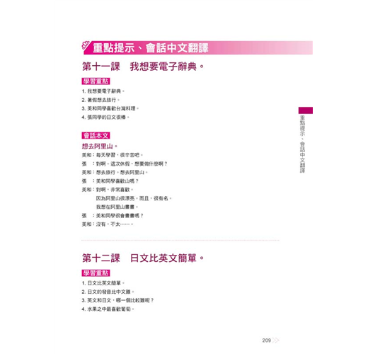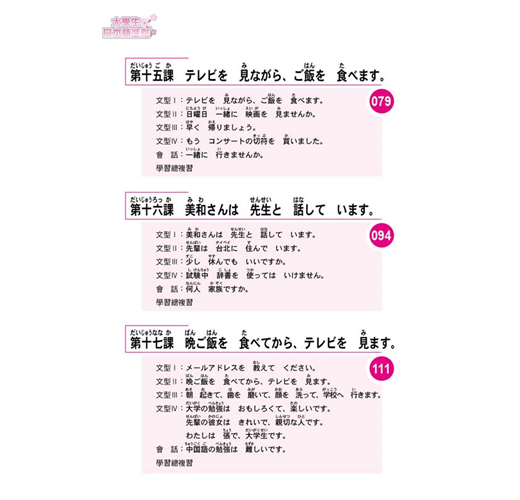 運用課程句型,集結3~4句為一短文會話的範例,讓學習者了解句型在日常會話中的活用場景,學習最實用的日語。