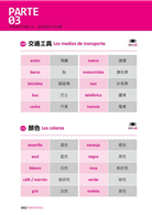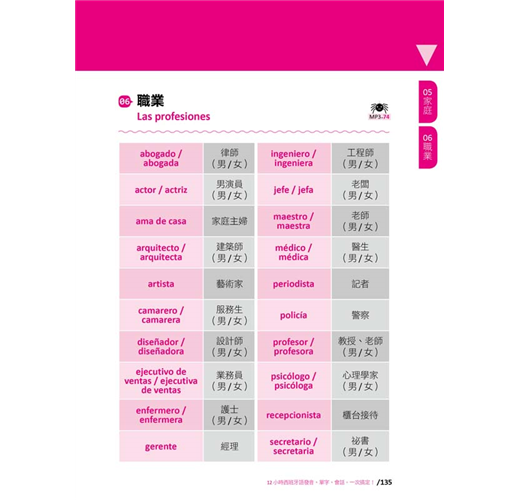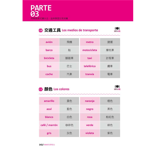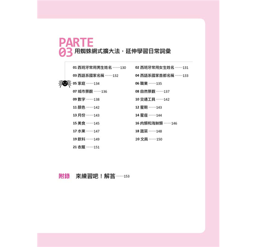 到PARTE 02為止,已經學習了西班牙語的基礎概念、發音、單字、例句到會話,下一步則是要累積、擴充自己的字彙量。本單元特別挑選了二十大類最實用、最基本的日常詞彙如「西班牙常用男生姓名」、「西班牙常用女生姓名」、「西語系國家名稱」、「西語系國家首都名稱」、「城市景觀」、「自然景觀」、「數字」、「交通工具」、「顏色」、「星期」、「月份」、「星座」、「美食」、「肉類」、「水果」、「蔬菜」、「飲料」、「文具」、「衣服」,以及最常用到的「動詞」,只要牢牢地記住這些單字,就能運用在任何的句子、會話裡,打下穩固的西班牙語根基。