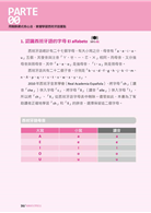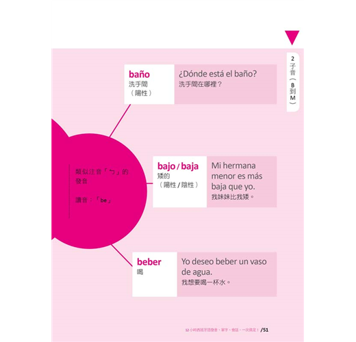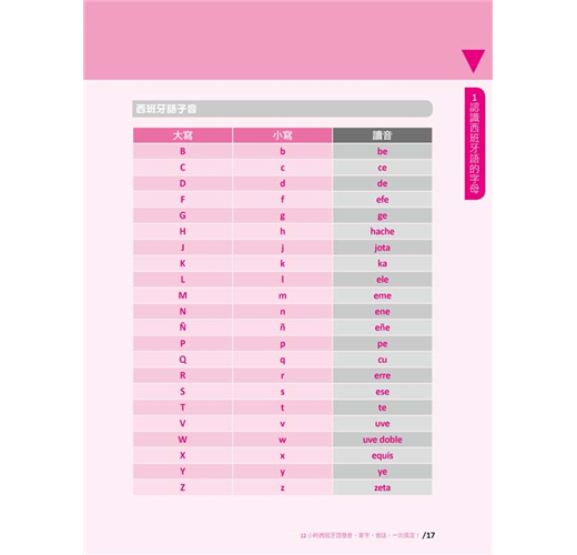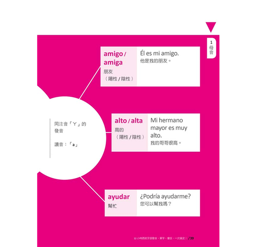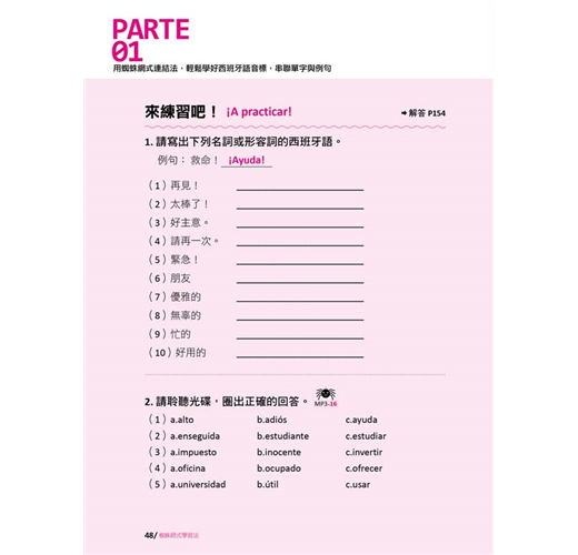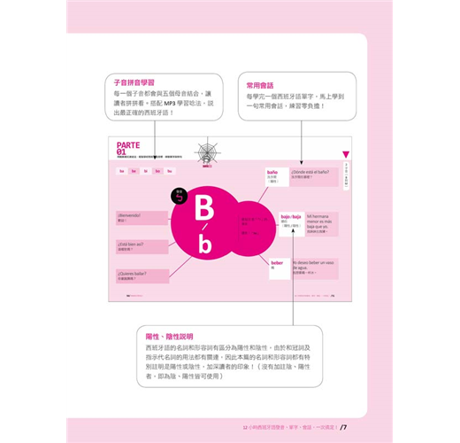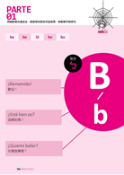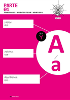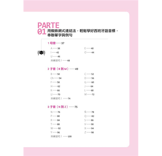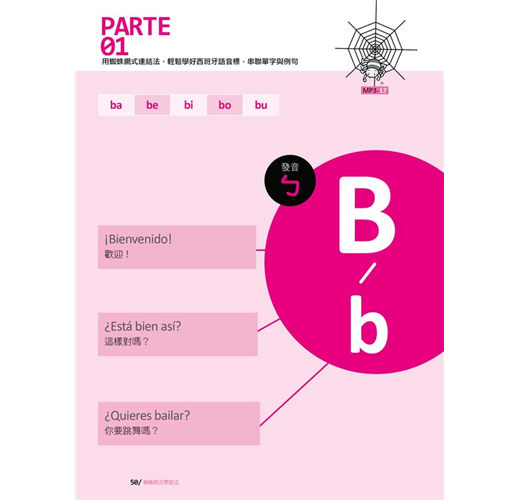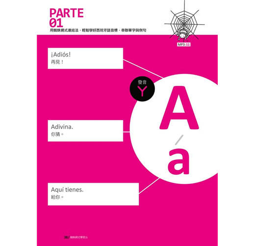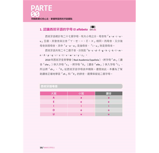 接下來就要學習最主要的西班牙語五個母音及二十二個子音。在這個單元中,作者除了說明字母的讀音之外,還用注音符號輔助說明每一個字母的發音,每個字母皆提供三個短句,加上由名詞、形容詞、動詞組成的三個單字、三個例句,經由蜘蛛網般的脈絡串聯起來,一線連結一線,結合成綿密的學習網絡,讓你同步學習字母、單字、例句。