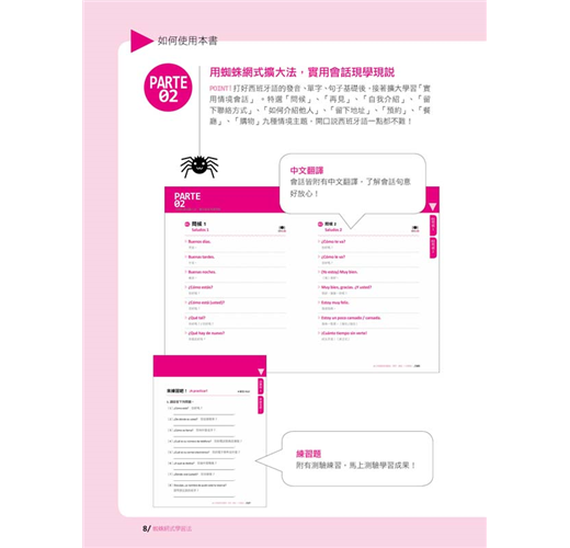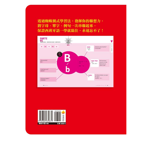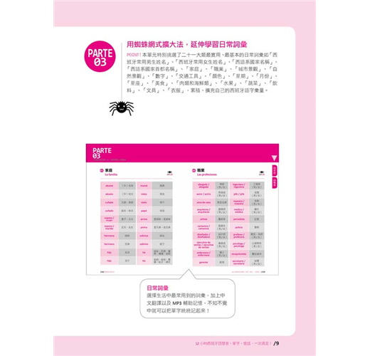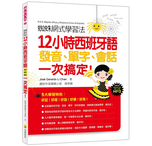 從吐絲開始,到結網、捕食、存糧,用「蜘蛛網式學習法」一步一步認識西班牙語、發音、單字到日常會話以及延伸日常詞彙,然後全部串聯起來,再搭配西班牙與拉美籍名師錄製發音+朗讀MP3加強學習,將所有學習到的內容,像是捕捉到的獵物一般,黏在自己所結的蜘蛛網上,快速記憶,絕對無法遺忘,你會發現,原來一次搞定西班牙語發音、單字、會話可以這麼簡單!