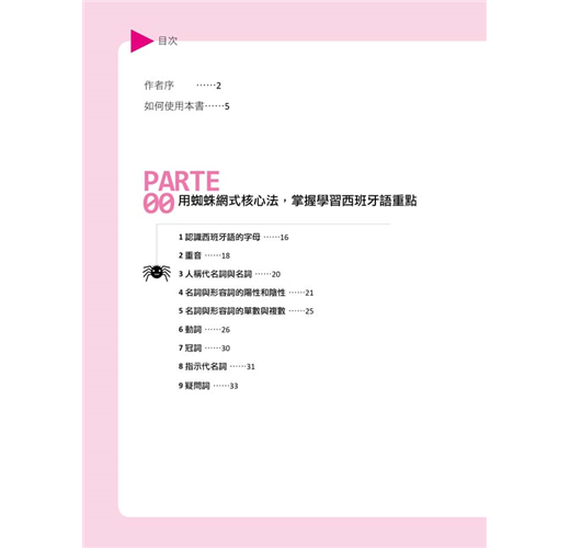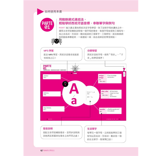 什麼叫做「蜘蛛網式學習法」?所謂的「蜘蛛網式學習法」猶如蜘蛛在吐絲、結網及捕食的型態,一網打盡必須學習的重點!本書就是採用這種方式,從認識西班牙語開始,然後逐漸延伸擴散到學習發音、單字、例句及會話等,這種多面向的學習方式,讓你不會在發音學習上裹足不前,而透過串聯的方式,能更廣泛地學習到單字及例句。接下來,就看看本書如何用「蜘蛛網式學習法」,讓你12小時一次搞定西班牙語發音、單字、會話!