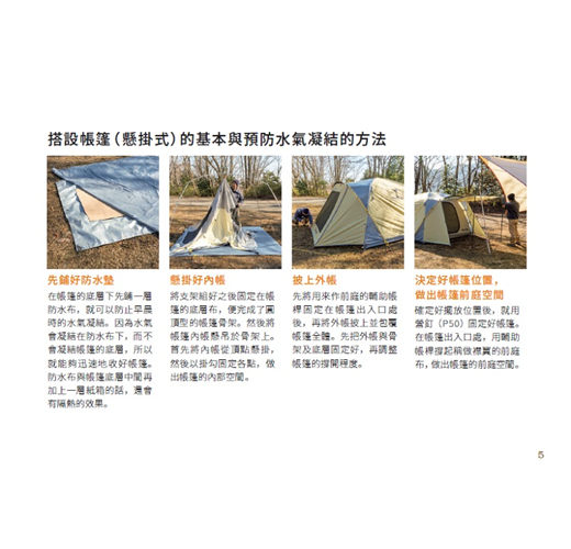 認識8種帳篷、行李裝載的6個祕訣、野外穿衣術、露營4種狀況的急救知識、營地挑選的6項基準、布置營地的7個要點、不費體力的6個紮營順序、雨天露營的5要點、6種露營照明……