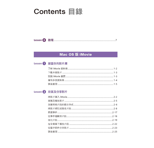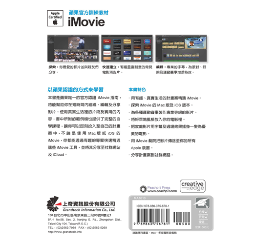 使用真實生活裡的片段及實用的內容,書中所附的範例檔也提供了完整的自學課程,讓你可以即刻投入至自己的計畫案中,不論是使用Mac 版或iOS的iMovie,你都能透過有趣的專案快速精通這些iMovie 工具,並將其分享至社群網站及iCloud。