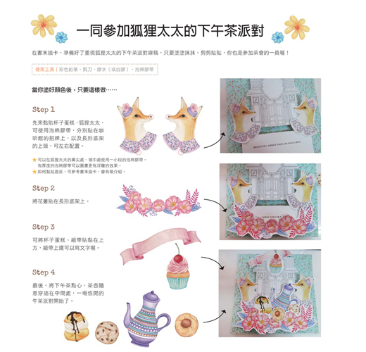 一起加入《狐狸太太的午茶派對》吧!將帥氣的狐狸太太、美味茶點塗好顏色,再剪貼摺紙,超立體感的午茶派對呈現在眼前。書末精心設計著色紙卡,當你塗完色、剪下來,按照步驟就能拼貼出一幅超立體的圖畫作品。