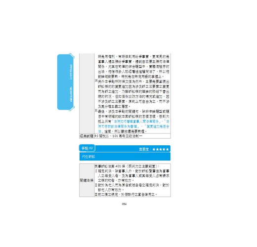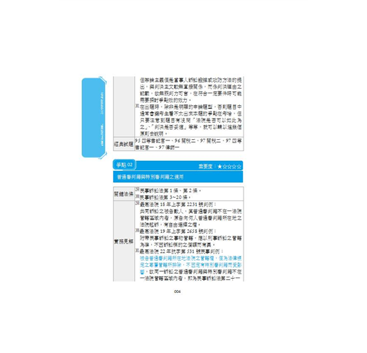 所以,筆者採用了相關聯概念或爭點,都置於同一個大爭點下的方式撰寫本書,雖然爭點數不過70餘個,但大多數爭點都是以爭點中帶爭點之方式呈現,如此複習,在見到較新穎的題目或是複雜的實例題時,才會有正確的思考脈絡可循,另外輔以破題關鍵處的關鍵字提醒,相信考生在面對民事訴訟法這個考科時,都能順利發現爭點並破題。另外,經典試題的部分,筆者收錄的是近10年國家考試中的民事訴訟法考科,並不包含研究所或國營事業考試,所以有的爭點下方試題處標註暫無,不代表它沒被出成考題過,只是近10年在筆者搜尋範圍內未考過而已。