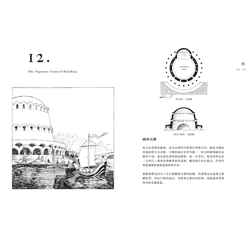 為理想國做設計,不須抄襲當代的建築式樣。「原作」與「抄襲」的不同,在於「原作」是呼應特殊需求(如用途、文化背景、地理環境)的作品,而「抄襲」只是形式的模仿。我圖中的建築物多半附有平面與剖面圖,因為建築不像繪畫或雕塑,它的內部空間很重要。這些插圖其實是建築圖,並非藝術繪畫。