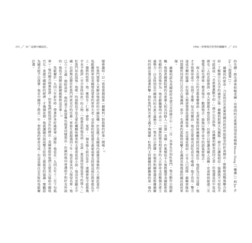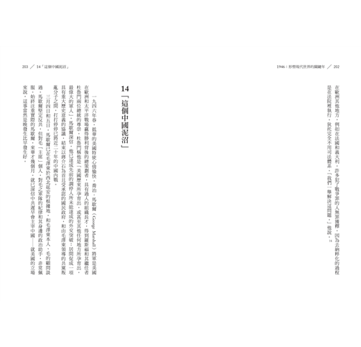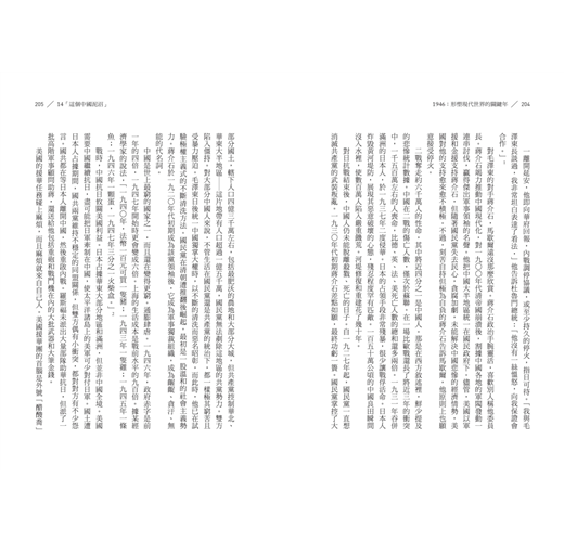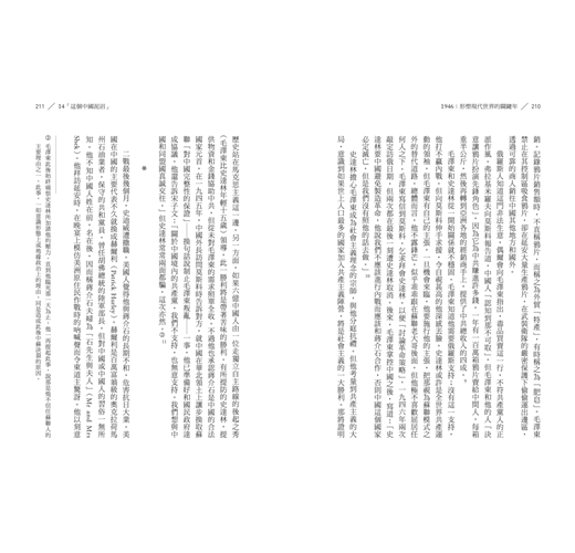 很多人可能跟我一樣,是先讀了二○一五年山西人民出版社的簡體版,才知道有《一九四六》這本書。很高興馬可孛羅出版社請到翻譯好手黃中憲重新翻譯,讓我們有個新的翻譯本可看。兩個譯本一比,立刻可以看出台版的優勢是什麼。首先,簡體版的英文題目有誤,封面寫的是The formation of the modern world,正確的寫法是The Making of the Modern World。其次,譯文的精確性,除了小部分的瑕疵外,還是黃中憲的譯筆較佳。而在內容的刪節上,原書〈這個中國泥沼〉提到毛澤東幾乎未出力抗日,共黨種植鴉片來賺取暴利來武裝軍隊、餵飽人民及支持高幹的豪奢生活的部分,礙於意識形態,簡體版悉數刪除,光是這章的字數就少了三頁的篇幅,這做法明顯剝奪讀者知的權益。