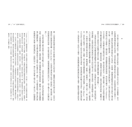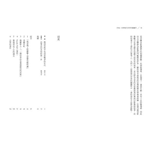 其次,由於近來參加了幾項歷史紀錄片的製作工作,引發了我對文字資料與影像紀錄相互轉換問題的興趣。據我個人粗淺的觀察,除了如何運用文字史料塑造歷史場景的問題外,目前國內的史學作品,受限於歷史寫作固有的敘事邏輯,在情節安排上尚有可觀之處,但較欠缺勾勒具體歷史場景及圖像的能力,很難順利轉化為影像語言。相較之下,雖然無法確認本書作者是否擁有影像製作的相關經驗,但卻能發現,在他筆下,畫面生動,具有十足的臨場感,因此由文字轉換為影像的門檻降低許多。雖然我本身接受的是傳統歷史學專業訓練,但強烈感受影像魅力在普及歷史知識方面具有的效果,並且認為未來的史家應該勇於嘗試以影像說故事,而如何著手?或許可以參考《一九四六:形塑現代世界的關鍵年》一書的寫作手法做為起點。