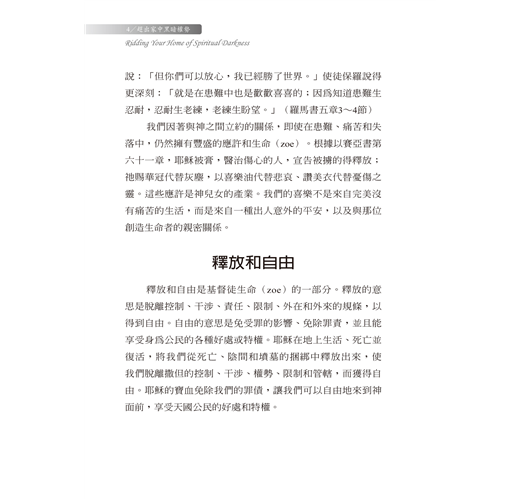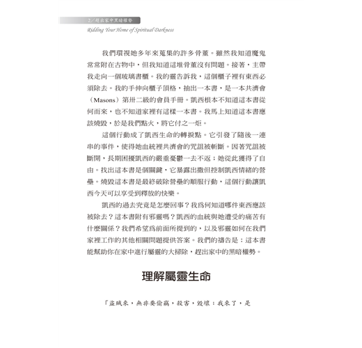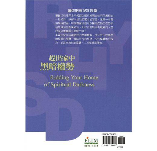 基督徒往往完全不知道仇敵已經藉由他們所擁有的一些物件,取得入侵他們家中的管道。這是一本實用易讀的書,每個基督徒都可以援用而為自己的家和所擁有的產業禱告,如此你將能向仇敵關門,並經歷到更豐盛的屬靈生命!