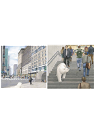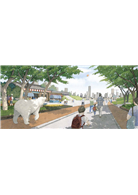無論是動物園或是大都市,對一頭北極熊而言,都是異域。其中一頁,北極熊在擁擠的地鐵站候車,列車開走後,只留下擠不上車的北極熊,彷彿象徵牠在這個城市沒有自己的位置。旅途上,北極熊眼前的城市動態,以及人們的生活、生產方式,例如滿街的車輛、堆積如山的廢棄物,和遠方工廠或焚化爐排放的廢氣,都是加速牠家園毀滅的肇因。當「全球暖化」開始受到關注以後,北極熊可說是此議題中最具代表性的悲劇物種,這本繪本雖然是以反思動物園為主,但仍藉由這幾個頁面,帶出氣候劇變對北極熊的衝擊。