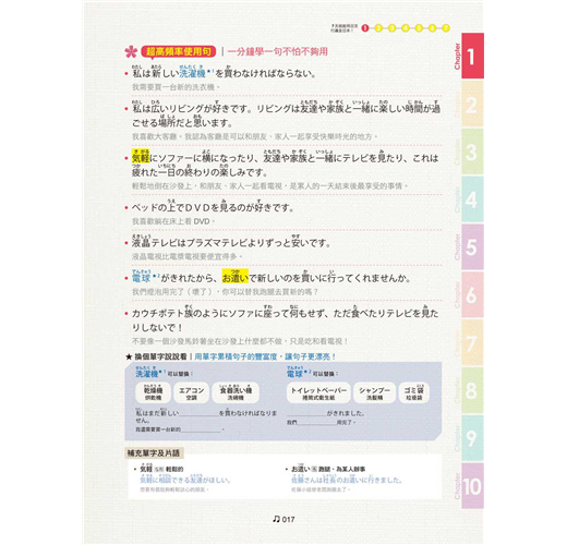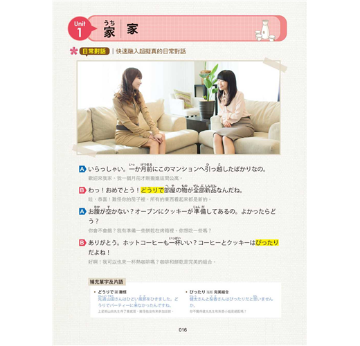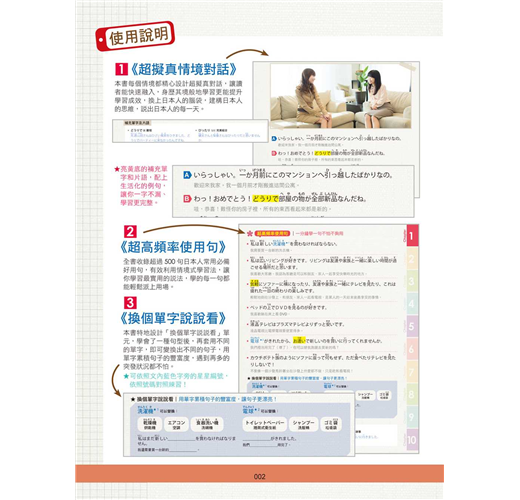 在日常生活中,我們可能會遇到各式各樣的狀況,依據不同場合,所使用的日文和單字也有所不同。這《日本語語言學校都在教的日語會話課》一書中,提供了不同的場合使用的會話和相關單字。所以,這本書不僅有著近似留學一樣的日文學習效果,而且對於準備到日本留學或是要去旅行的人都相當有幫助。
