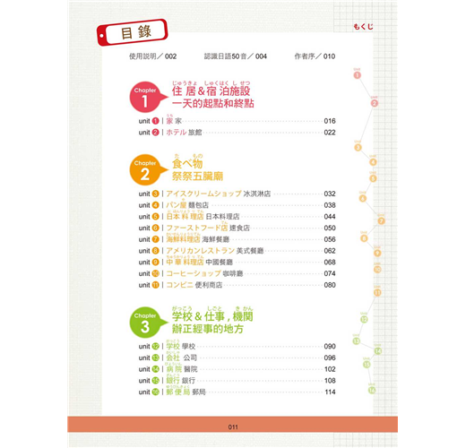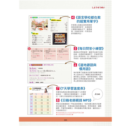要學好日語,持續不斷的努力很重要。有耐心且持續的學習是進步的關鍵。這本書精選了38個在日本最常見的情境,每個單元都有實境對話、超高頻率使用句、單字、諺語與慣用語,並配合實景照片,希望讀者能藉由照片的輔助之下,幫助記憶、加強學習效果。也可搭配日籍老師親自錄製的MP3學習,聆聽正確的發音、道地的腔調,加強自己的聽力能力。此外,本書更貼心設計了7天學習進度表,讀者可以依照自己訂定的時間表學習,從中得到成就感。