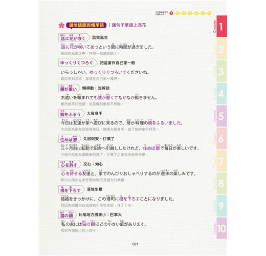 很多學生常常問我,為什麼背了很多單字、文法也學了一些,但是在實際上與日本人對話或是看日劇、電影時,卻常常不解其句意?其實是因為日本人在日常會話中經常穿插使用諺語及慣用語,而這些語句是在一般的日語學習書沒有教的。所以,我們也特別在這本書中介紹相關聯的諺語和慣用語。這些知識絕對會是增進你與日本人溝通中很重要的一環。此外,也列舉了新的流行用語和新詞,除了激發學習者的興趣,同時還可以接觸到日本人的語言文化。